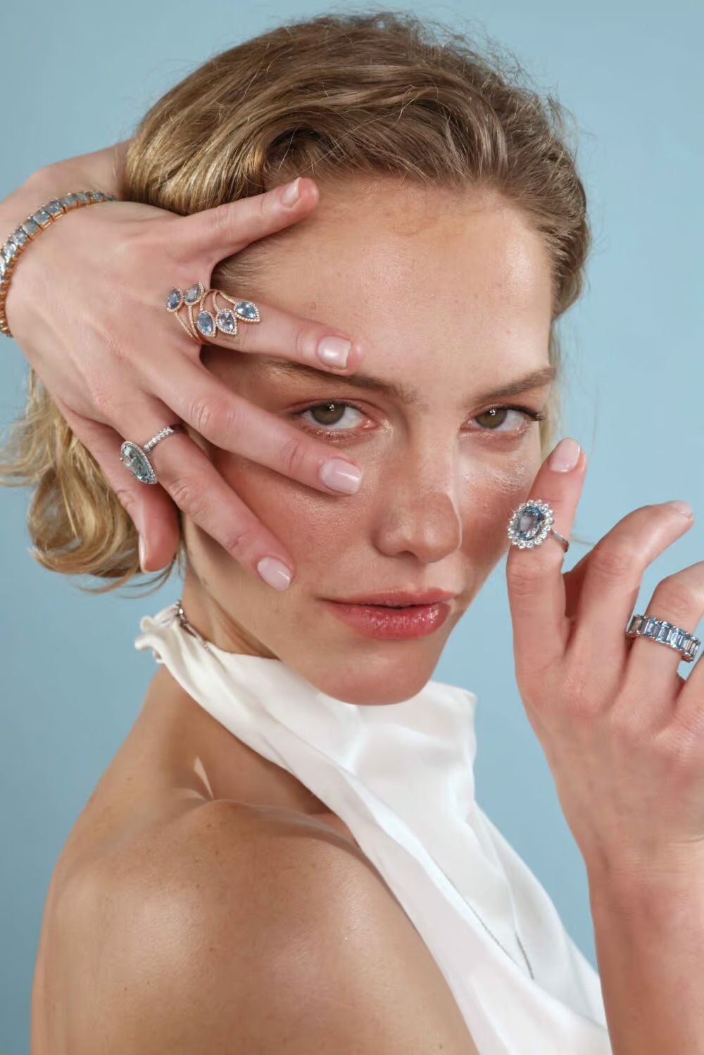 Gorgeous 4.28ct oval-shaped aquamarine surrounded by 1.26ct round white diamonds in white gold.
