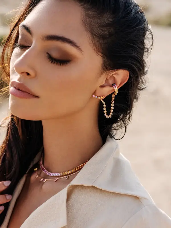 Celebrate color, joy, and individuality with this radiant earrings set from MoujahidJewels’ Dreamy Collection. Crafted in 24K rose gold, each earring features a harmonious gradient of natural, untreated rainbow sapphires in brilliant cut, anchored by a vivid pink sapphire stud — a detail that adds depth and charm to an already captivating silhouette.