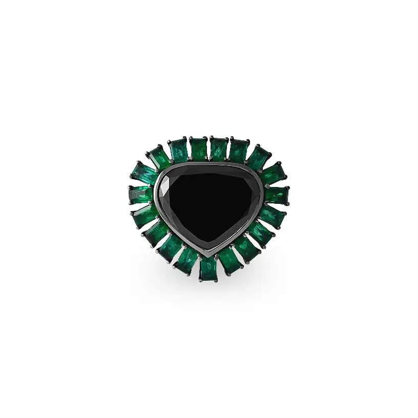 A bold expression of contrast and refinement, this Haute ring by MoujahidJewels features 9.06 carats of natural black diamonds, accented with 3.22 carats of vibrant baguette-cut emeralds. Crafted in 18K black gold and set in a sleek bezel silhouette, the piece exudes presence, structure, and timeless rarity.