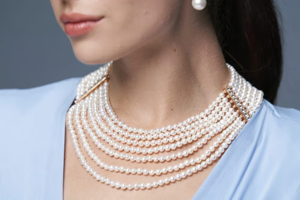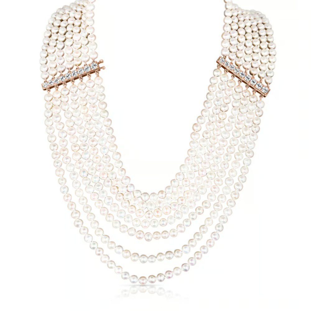 Seven lines of beautiful 7mm pearls and a dazzling 6.3ct brilliant round aqaumarine all set in 24K white gold.