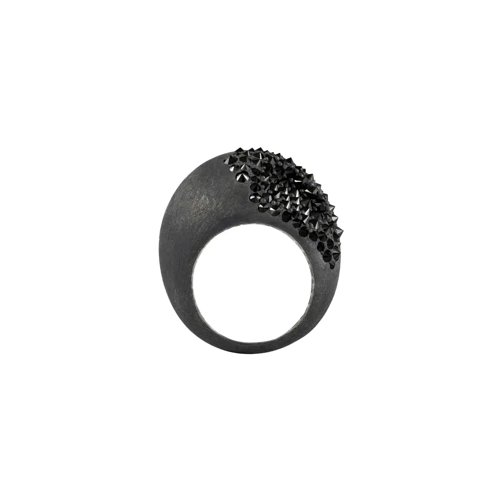 Crafted in polished silver and set with bold black diamonds, the Pumped Ring by MoujahidJewels delivers a striking fusion of power and precision. Its architectural form and dark brilliance make it a modern icon for those who wear boldness like a signature.