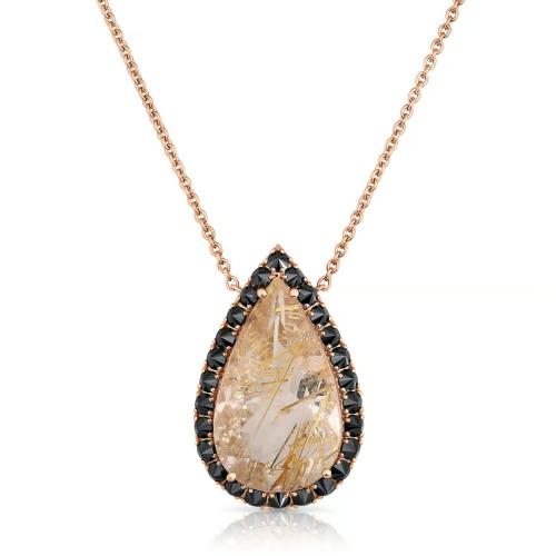 Fabulous pear-shaped 19.59ct rutile smoky quartz with inverted black diamonds totaling 7.11ct on 24k rose gold chain.